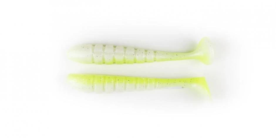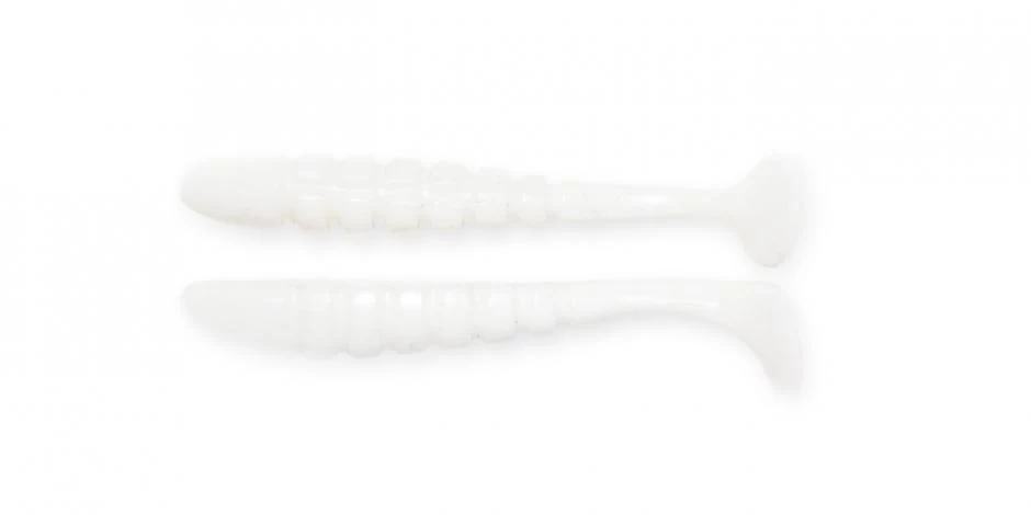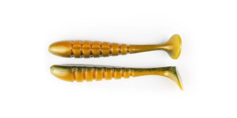 It has a specialized design with unique ribbed sides and a special three-dimensional paddle tail, providing a lifelike movement and vibration making the bait rock back and forth as it swims. Rig on a Swimbait head, Jig Head or belly weighted EWG Hook and slow roll deep structure or burn over shallow grass and over flats.